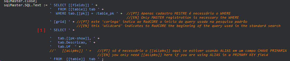 The application of this wildcard will be used in forms inherited from frmBaseCRUDDetail where it is not necessary to display the PK (master code) on the grid but it is necessary to mount the select with it.