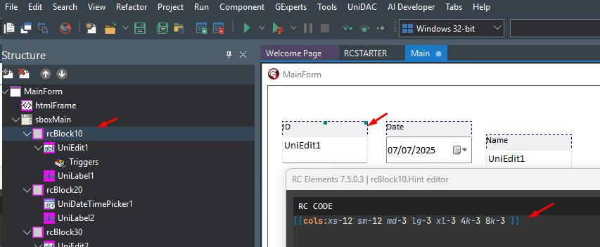 Each responsive block is simply a UniContainerPanel, native to UNIGUI, but with a configuration that will be interpreted by RadCORE at runtime.