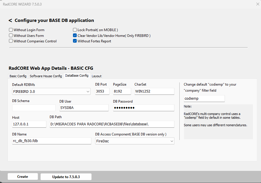 In RC WIZARD, after clicking on the BASE DB template, the following screen will be displayed: