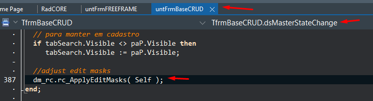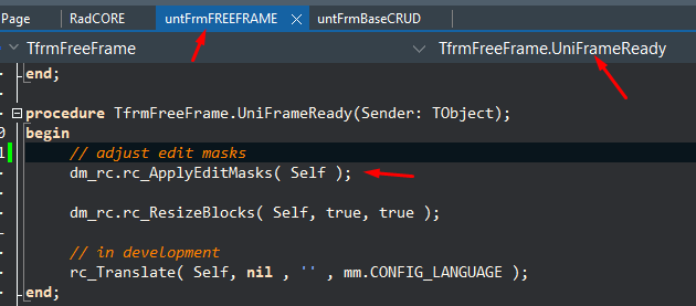 The function "dm_rc.rc_ApplyEditMasks( Self );" is responsible for rendering components that have "mask:" attributes and must be called in the "...ready" event of the frame / form: