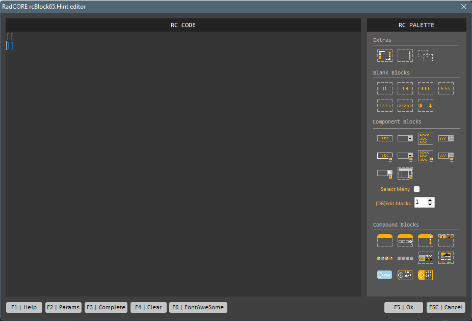 Pressing F3 (do not click) with the RC CODE blank will add the brackets to fill in the commands.