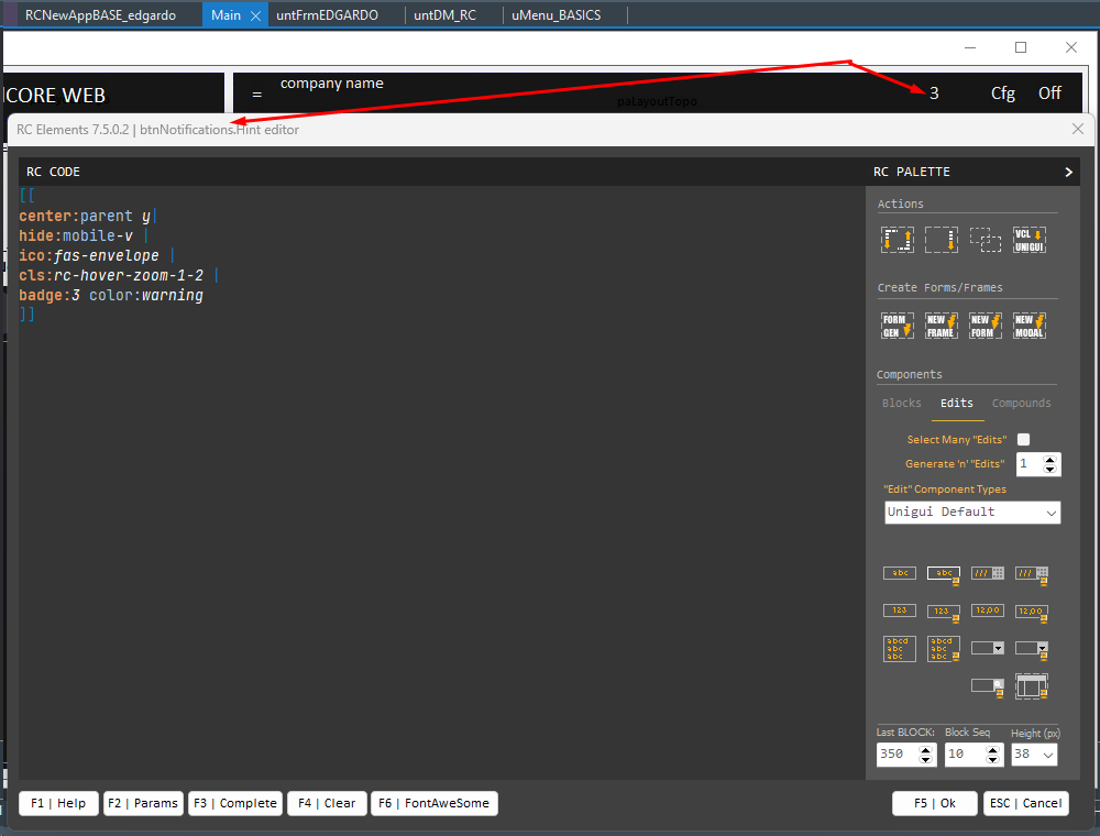 In the case of HINT, a diverse editing "environment" will be displayed, with colorization features for RadCORE's "dynamic attributes/commands," a component "palette," a basic "object inspector," a dialog box with information about each item, and the ability to trigger a HELP function for each "command," as shown in the image above.