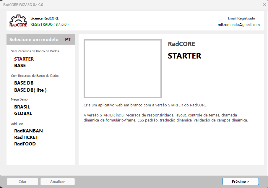 O RadCORE WIZARD( RC WIZARD ) é onde você irá criar as aplicações com a estrutura pronta do RadCORE.